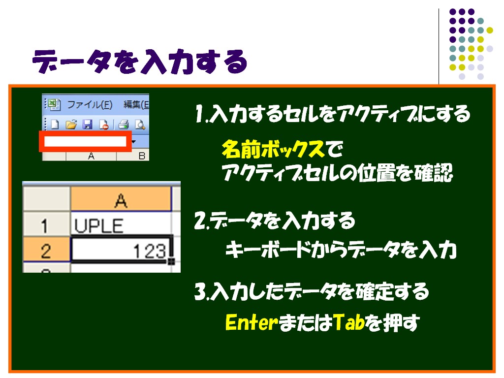 ※名前ボックスでアクティブセルの座標を確認 - キーボードを使ってデータを入力します。